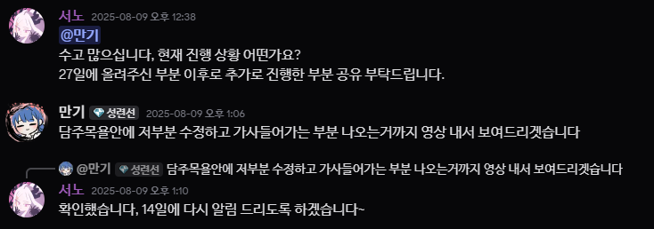제작 기간 동안 일정 횟수의 체크일을 정해두고, 해당 날짜에 맞추어 각 파트의 제작이 어느 정도 진행되었는지 파악해야 합니다. 기간 설정은 합작마다 전부 다르겠지만, 만약 매 주말마다 체크를 실시한다면 너무 숨 막혀서 별로 작업하고 싶은 마음이 안들 수도 있겠네요... 잘 생각해서 적절한 기간을 설정하도록 합시다. 일반적으로는 합작 서버 내에서 체크를 실시합니다만, 경우에 따라서는 각 참가자와의 DM으로 연락을 취하는 경우도 있습니다.