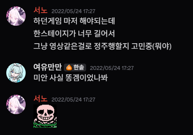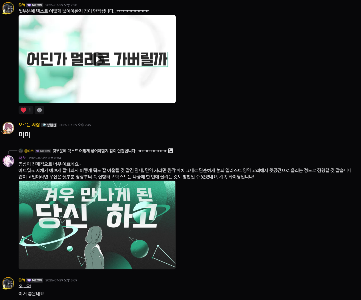 A는 안타깝게도 대지각을 해버렸습니다. 마감일은 진작 한참 전에 넘기고, 업로드 이틀 전이 되어서야 겨우 영상을 마무리하고 제출해 낼 수 있었네요. 하지만 그 도중 과정에서는 꾸준히 진척을 공유하고 피드백을 주고받았으며, 마감일을 넘긴 상황에서도 계속해서 연락은 아주 빠릿빠릿하게 잘 유지되고 있었습니다. 평소에 합작 서버에서 이야기도 자주 참여하고, 다른 사람의 진척에 리액션도 자주 남기며 꽤 적극적인 모습을 보여주었네요. 합작에 폐를 끼칠 뻔했다는 것을 스스로 인지하는 모양인지, 내심 다른 구성원들에게 미안함의 표시도 하고 있습니다.