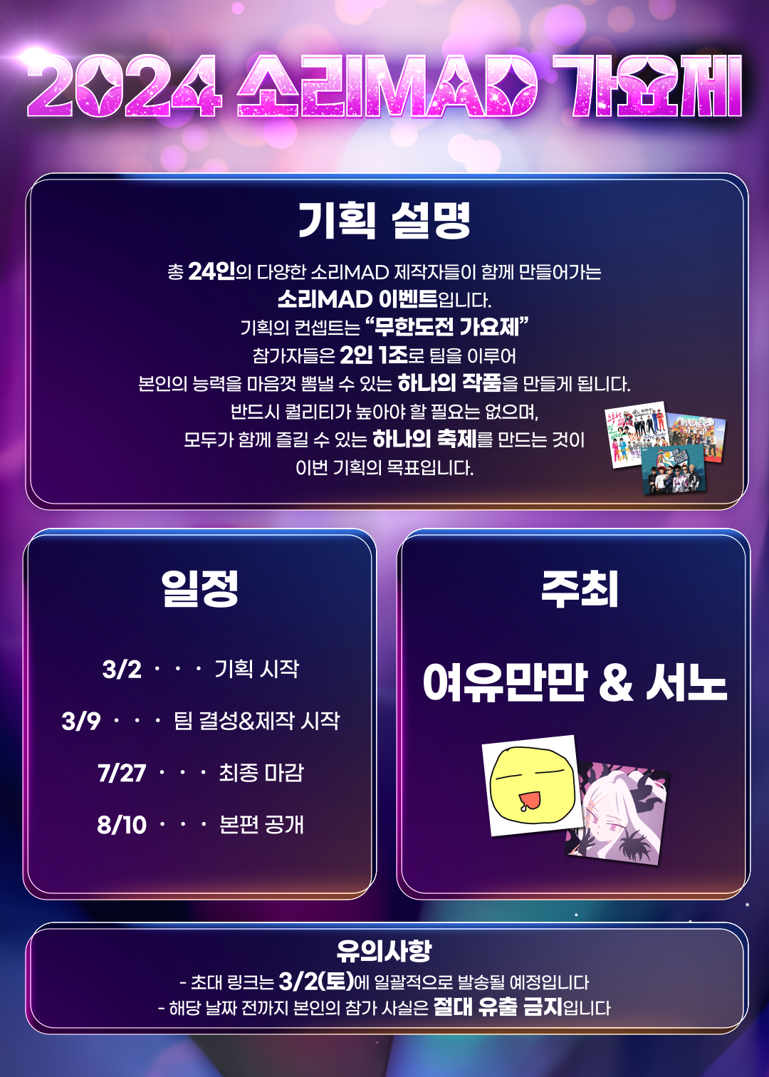 2024 소리MAD 가요제에서는, 주최에서 미리 어떤 분야마다 스태프가 필요한지, 해당 분야에 적임자는 누가 있는지 등을 사전에 미리 철저하게 전부 정해놓은 후, 직접 찾아가 해당 역할에 대한 명확한 설명과 함께 초대를 드렸습니다. 작문 담당, 일러스트 담당, 소개영상 담당, 예고편 담당, 그 외에도 정말 많은 분야가 있었습니다. 생소한 포지션을 요청드린 만큼 이 기획 안에서 어떤 역할을 해주어야 하는지를 최대한 납득 가능하게 설명하는 것이 중요 포인트였습니다.